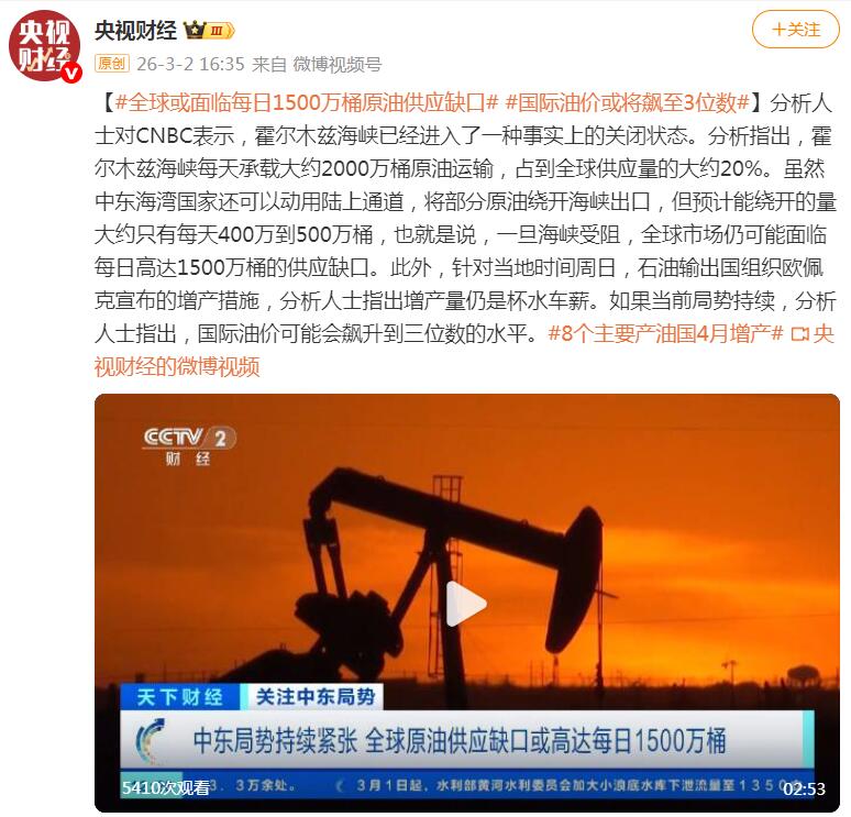 据@央视财经报道,分析人士对CNBC表示,霍尔木兹海峡已经进入了一种事实上的关闭状态。分析指出,霍尔木兹海峡每天承载大约2000万桶原油运输,占到全球供应量的大约20%。虽然中东海湾国家还可以动用陆上通道,将部分原油绕开海峡出口,但预计能绕开的量大约只有每天400万到500万桶,也就是说,一旦海峡受阻,全球市场仍可能面临每日高达1500万桶的供应缺口。此外,针对当地时间周日,石油输出国组织欧佩克宣布的增产措施,分析人士指出增产量仍是杯水车薪。如果当前局势持续,分析人士指出,国际油价可能会飙升到三位数的水平。