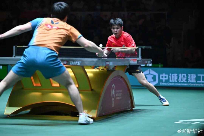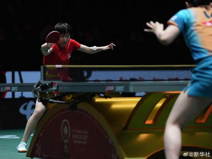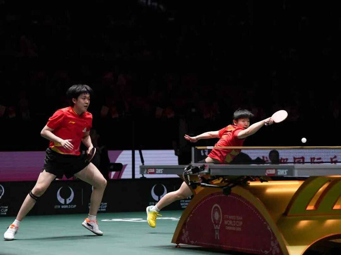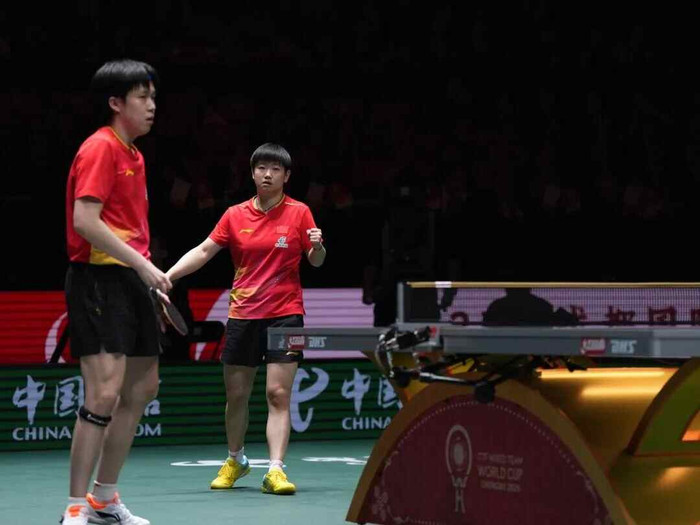 12月7日,中国队组合王楚钦/孙颖莎(右)在混双比赛中庆祝得分。他们3比0战胜日本队组合松岛辉空/大藤沙月。新华社记者王曦摄
