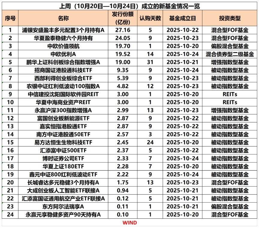 10月24日,华夏基金发布华夏盈泰稳健六个月持有期混合型基金中基金(FOF)基金合同生效公告。根据公告,该基金募集期间净认购金额为24.05亿元。此外,于10月22日公告成立的浦银安盛盈丰多元配置3个月持有混合FOF,募集规模也超27亿元。