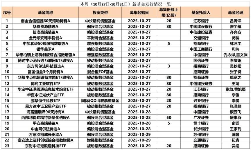 本周(10月27日至10月31日),全市场共有23只新基金(仅统计主代码)面市。其中,主动权益类基金和指数型基金成为发行主力。显然,在A股回暖的背景下,各家基金公司希望抢占先机,纷纷发力布局权益类基金产品。